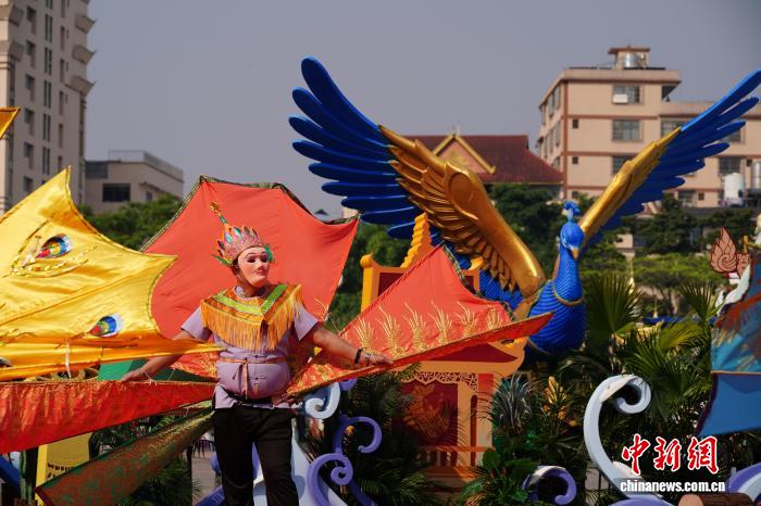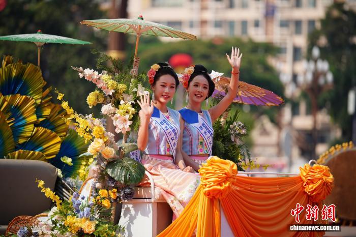 图为傣族女孩趁坐花车巡行。中新社记者 刘冉阳 摄